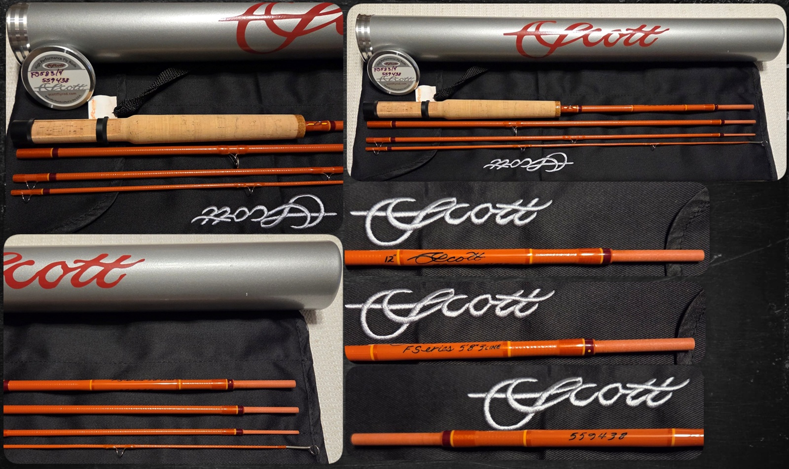 Scott F Series 583-4 ~ 5'8" ~ 4pc. ~ 1.73oz. ~ 3wt. ~ Serial No. 559438 ~ NEW ~ From the maker: “With the all new F Series, we brought together new slimmer tapers with E-glass and our redesigned hollow internal ferrule to set a new standard for smooth, deep flexing rods. And, even though you can cast them a lot farther, these rods are optimized to cast beautiful accurate loops under 20 feet. By carefully controlling the distribution of mass and stiffness, we created very light fiberglass rods that are stable and form sweet loops with just a few feet of line out of the tip. That way you can accurately cast into the next plunge pool or along overgrown banks even on creeks you can step across. That’s not something your graphite rods can do easily. We paired that performance with best in class components like Snake Brand Universal snake guides, Flor grade cork grips, titanium SiC strippers, and CNC milled reel seats, and then added our little touches like measuring wraps and alignment dots. We didn’t miss a detail. After all, there’s a lot of history and pride in F Series rods. So, if you’re in to fishing small pristine waters, and jewel like wild fish, treat yourself to the ultimate fishing tools-F Series rods from Scott-High performance, handcrafted, and pure fun.” It features Scott’s proprietary E glass is an innovative highly unidirectional glass and epoxy composite that helps us continue to advance fiberglass rod design. Our glass rods are light, responsive, and exhibit the highest recovery speeds in fiberglass rods. Now you get all the feel of glass with high performance. It features a natural finish proprietary E-glass blanks built to exacting tolerances, clear silks with burgundy accents at the HK and ferrule stations, rust-proof patented nickel titanium snake guides made from 'memory metal' that always return to their original shape even after being crushed or bent, spigot ferrules, extra flora grade cigar grip married to a morticed cork seat fitted with black D/L’ing cap and ring hardware, composite check and HK station. It comes with the original black Scott labeled bag and Scott labeled metal tube with maker and rod info included on the tube cap. This unfished Scott classic glass retails for $695. Wanna save a coupla C-notes? $495